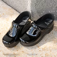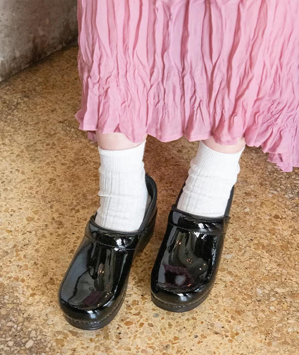 APMA(アメリカ足病医学協会)に認定されている、ダンスコのプロフェッショナル。後藤さんにとってなくてはならない定番アイテムのひとつです。「立ちっぱなしでも疲れないし、合わせるボトムも選ばない最強シューズ。低身長コンプレックスを解消してくれる5cmヒールも頼りになります」。アッパーはツヤめく牛革パテント、アウトソールは弾力性のあるポリウレタン素材。