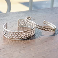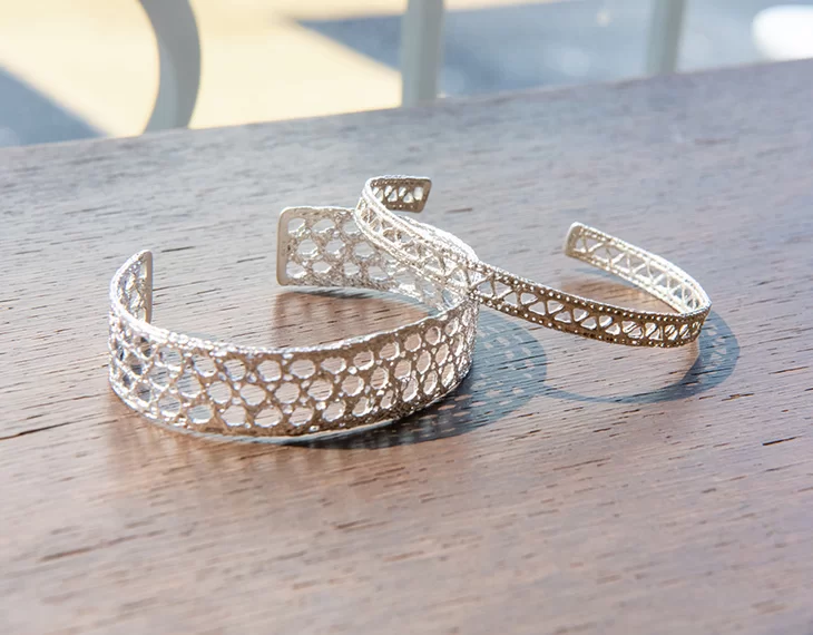 1920〜30年代のフランス製ヴィンテージレースから型を起こし、高い技術を要する手作業によって作られたレースバングル。後藤さんもこのレースのデリケートな女性らしさが好きで愛用中です。「レースならではの繊細な透け感は、目にするたびに思わずうっとり。2本を重ねづけしてもきっとステキですね」