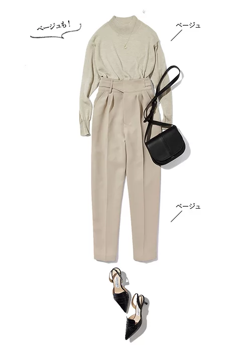 ごくシンプルなデザインながら、ニットの美しい透け感に女性らしさが漂って。パンツはベルトのボタンでウエストのサイズ調節が可能です。