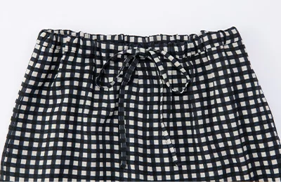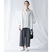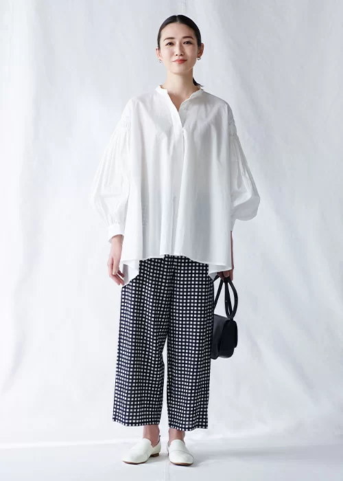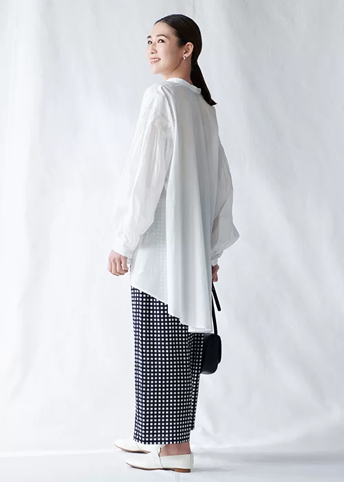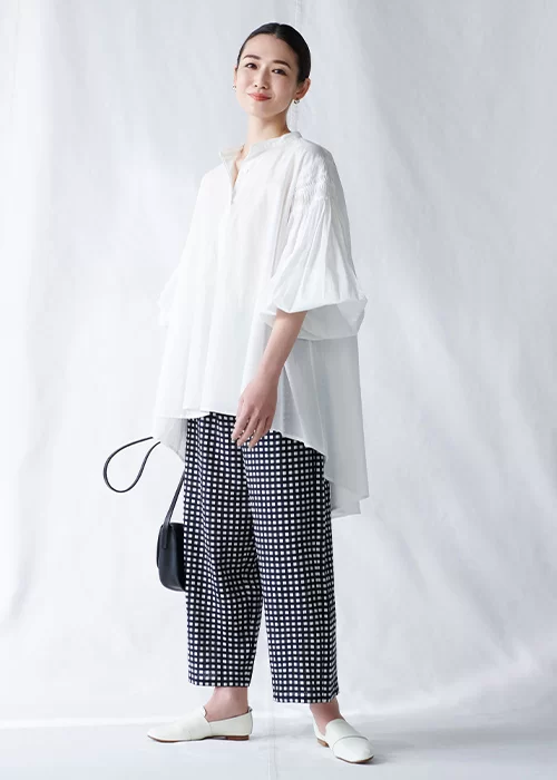 前後差のあるアシンメトリーな裾が目をひくシャツは、バルーンスリーブの袖をたくし上げることで、違った表情を楽しめます。柔らかな素材感とワイドシルエットが特徴的なパンツは、大人に似合うブラック×ホワイトの上品なギンガムチェック柄。両アイテムとも細やかなディテールが効いているので、シンプルながらも華やかな雰囲気に。風通しのよいシルエットで、汗ばむ日も心地よく着こなせます。