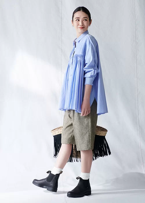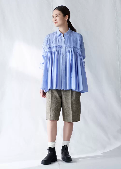 ワイドな身幅と胸元のピンタックデザインが効いたシャツは、胸下がふんわりとしたシルエットで、お腹や腰回りを自然にカバーしてくれます。お尻がやや隠れる絶妙な丈感で、手持ちのパンツとも相性抜群。ボタンを開けると羽織りのようにも着ることができ、季節に応じて様々な着こなしが楽しめます。