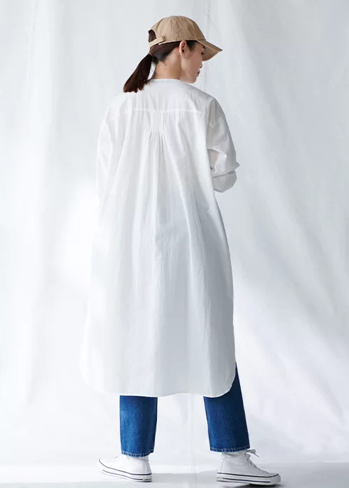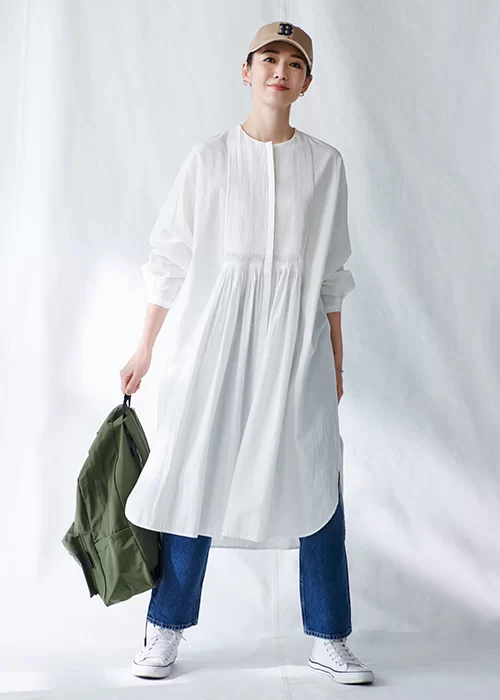 1枚で着るのはもちろん、羽織りやインナーとしても活躍するワンピースは、シーズン問わず活躍してくれるお役立ちアイテム。前後差があり丸みのある裾や、やや深めのサイドスリットを施すことで足さばきが良く、アクティブに過ごしたい休日スタイルにもぴったりです。丈感は身長167㎝で膝下くらい。胸元の細かなピンタックが、大人カジュアルに可愛らしさをプラスしてくれます。