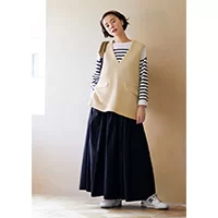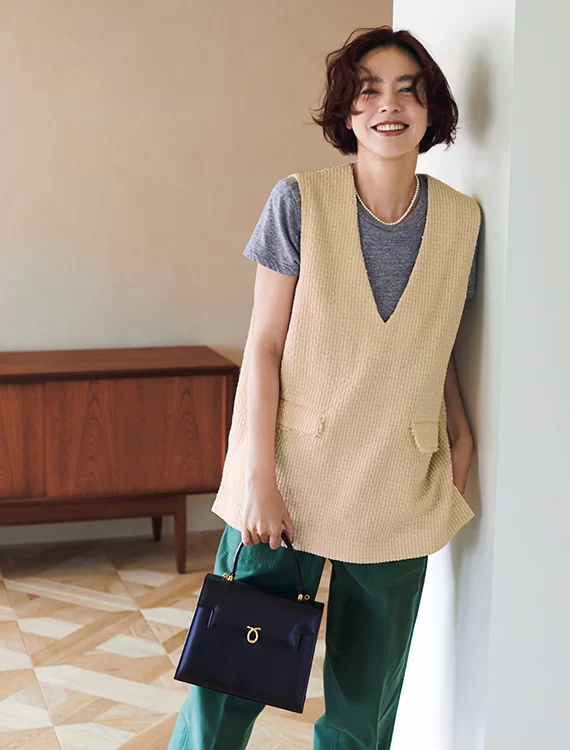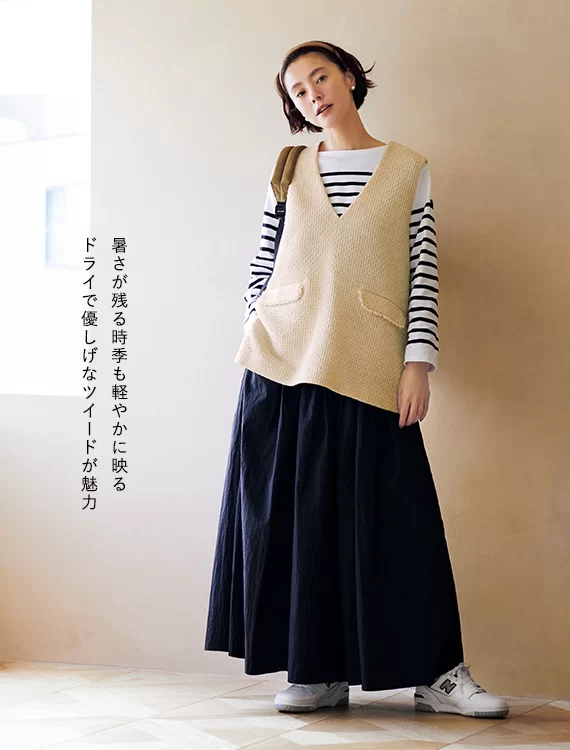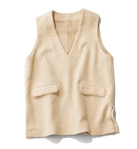 夏の大定番コーデのTシャツ+カーゴパンツに、ただ重ねるだけで秋らしい上品さと奥行きが醸し出せるツイードジレ。身幅には適度なゆとりを持たせつつ、Vネックは深く、シャープに。そんなメリハリをきかせたバランスがカジュアル派向きです。おなかまわりやお尻が隠れる着丈もポイント。