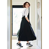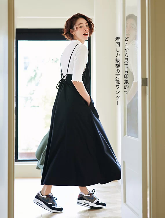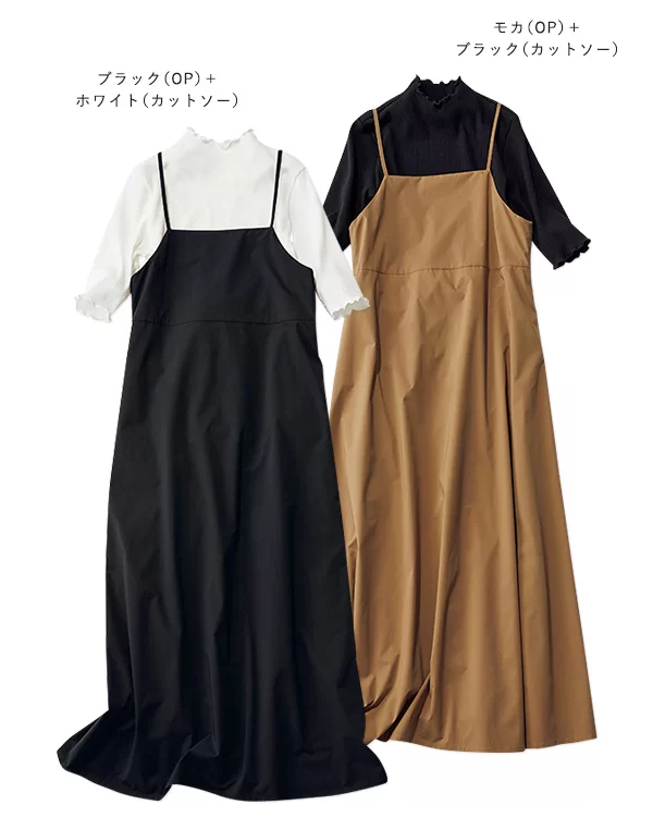 簡単に大人の可愛げが叶うトップスとワンピをセットに!ワンピは撥水性としなやかなストレッチ性を備えた、マットな質感の生地。ゆるやかに広がるAラインシルエットと、華奢なストラップの対比、背中のレースアップで、360度存在感あふれる着姿に。ハイネックの首元と袖口にメローロック始末を施した太めリブのカットソーは柔らかく、ほっそり見えしつつも窮屈さを感じない着心地。二の腕がカバーできる五分袖です。ブラック×ホワイト、モカ×ブラックの2色で展開。