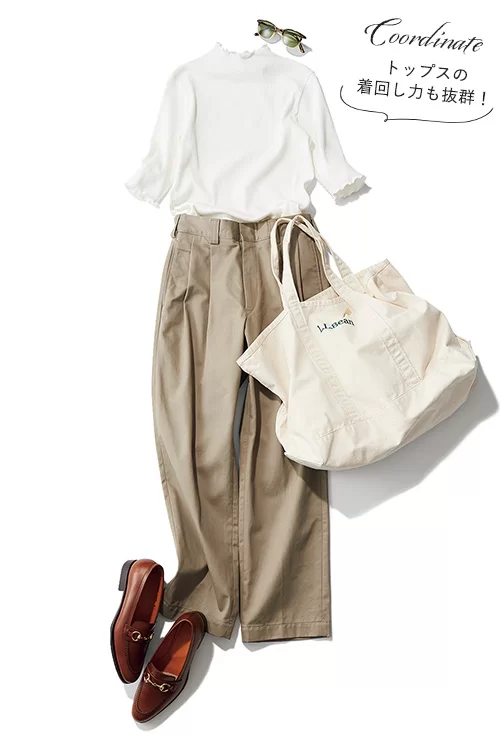 トップスは今は一枚で、秋以降はカーデやジャケットのインナーにもおすすめ。