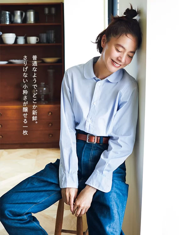 一枚でもサマになりインにも使えるシャツは、季節の移行期に頼りになる存在。小ぶりな丸衿が、大人の可愛げをほんのり引き立ててくれます。