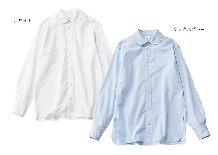 顔まわりに新鮮さをくれる甘すぎない丸衿がポイントのシャツを、便利なホワイトとサックスブルーで作りました。コットン100%のブロード生地は、フラットかつなめらかな表面感が特徴。タイトすぎずゆるすぎないボックスシルエットで、秋冬はインナーとしても重宝します。裾はタックインしなくても決まるサイドスリット入りのラウンドカットに。