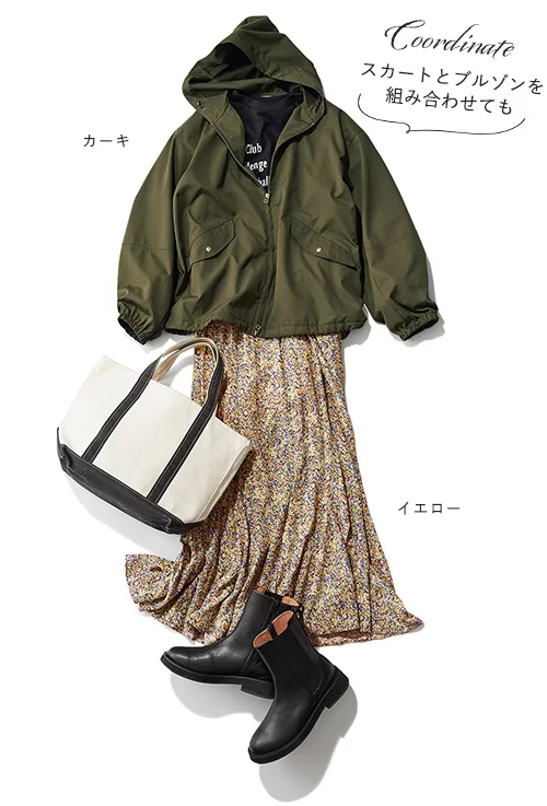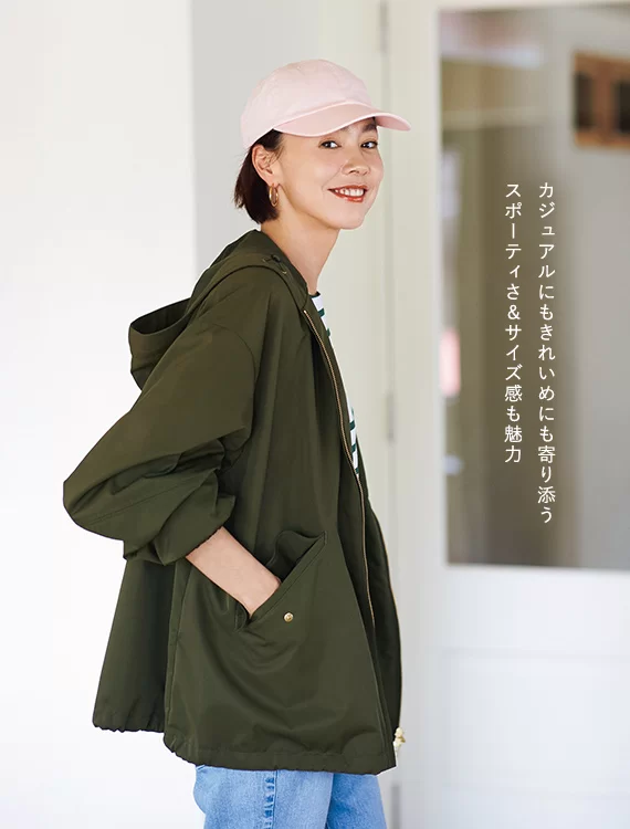 撥水機能を備えたきれい見えブルゾンは、通勤からお出かけ、子どもとの公園などシーンレスでお役立ち。冬はコートにインして着るのも◎