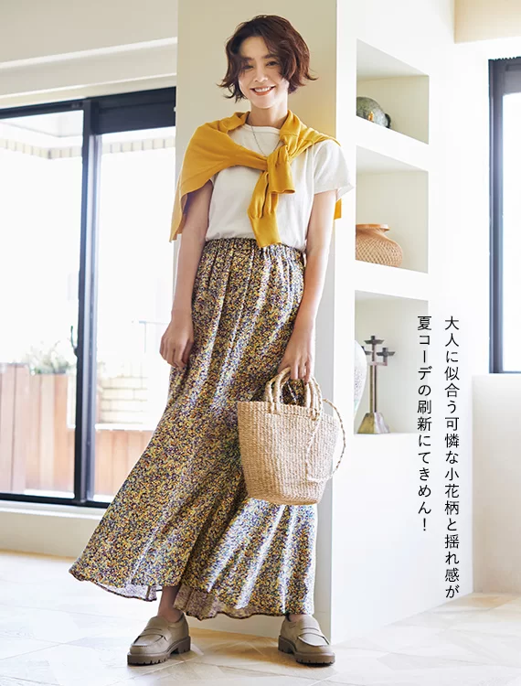 ウエストゴムで楽ちんなはき心地ながら、体型カバー力も抜群と、まさに大人に優しい旬柄スカート。どんな靴とも合わせやすい丈感です。