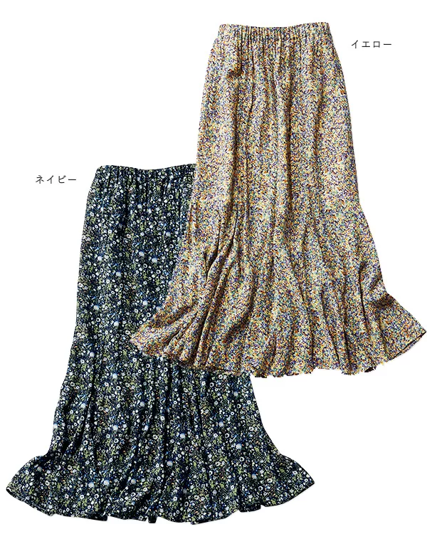 ドレープ感や揺れ感がきれいな薄手のキュプラレーヨン生地に、手描き風の小花柄をプリント。タックインがしやすいゴム入りのウエストから太ももまではスッと落ちて、ひざあたりからフレアになるマーメイドシルエットで細見えを演出。Tシャツから毛足の長いモヘアニットまで、どんな素材や厚みのトップスも受け止めます。ひざまで裏地付きで、両サイドには便利なスリットポケットをセット。イエローとネイビーが基調の2色展開。