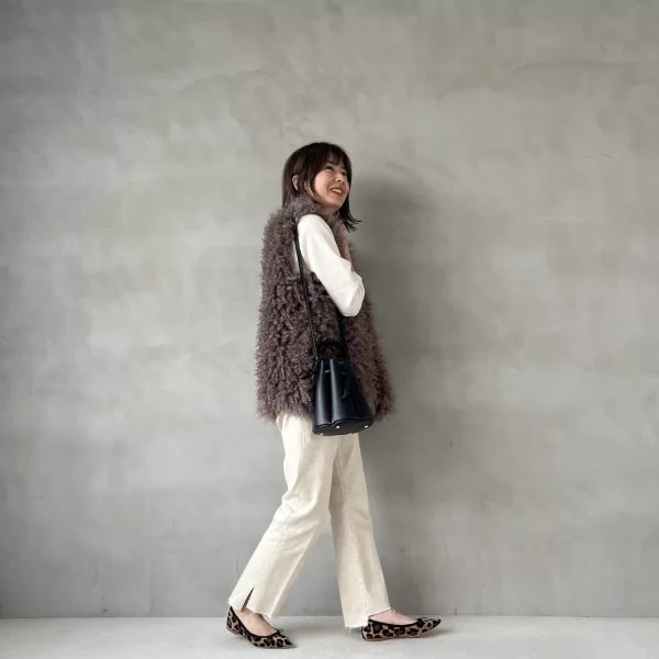 レオパード柄がやや大きめでインパクトがあるので、服はやさしいトーンで上品にまとめるのがコツ。白ニット+白デニムだけでも十分決まりますが、トレンドのファーベストを足してより今年っぽく。