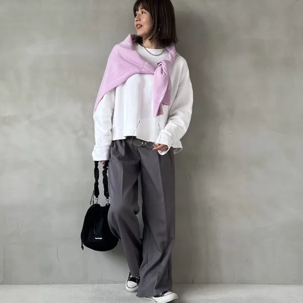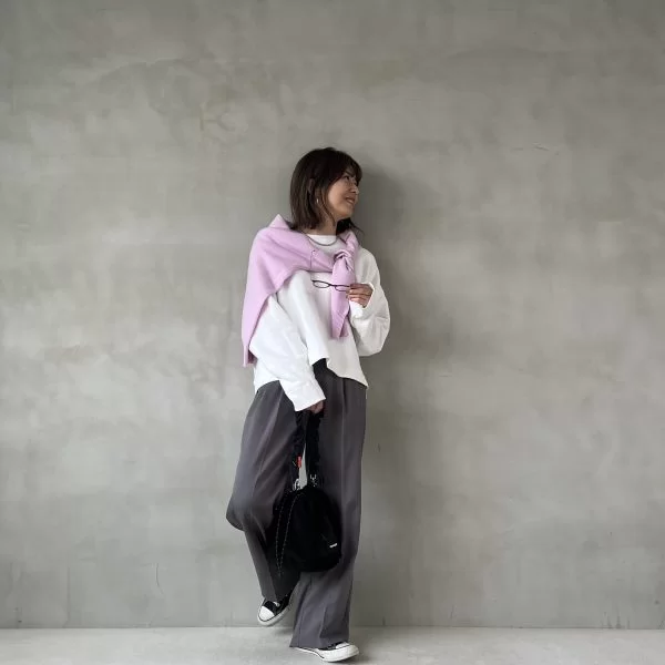 普通に着るのはもちろん、ゆるっと巻くのにもちょうどいい大きめサイズのタートルニット。スウェット+ワイドパンツでちょっと華やかさがほしいときに、こんなラベンダーのひと巻きが効いてきます。