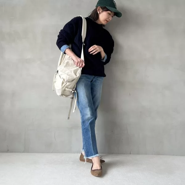 ブルーはもちろんインディゴ、水色、白、黒、グレー……とどんな色のデニムにも合うキャメルの靴は、もっとも出番の多い一足。今日は大好きなデニムonデニムにユニクロのメンズニットを重ねた着こなしで。