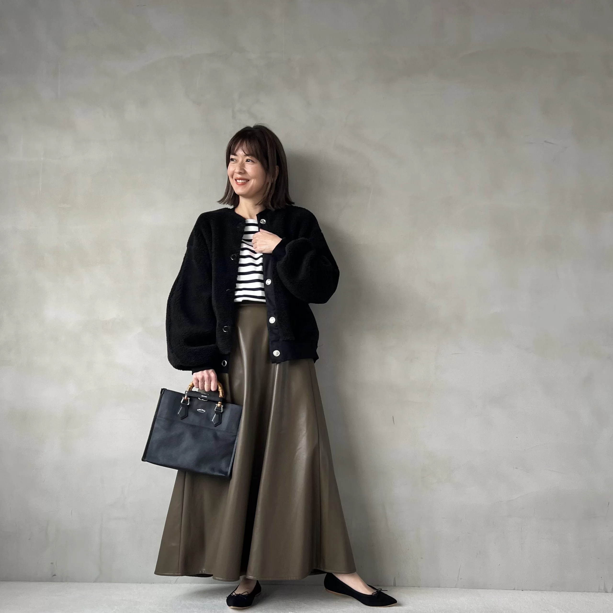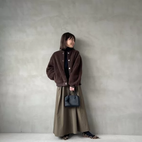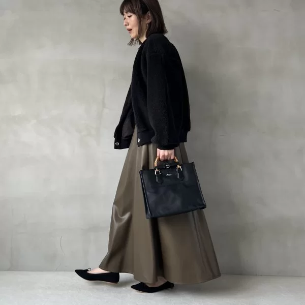 ボアの可愛さをほどよく引き締めてくれる、辛口なカーキのフェイクレザースカートを投入。靴やバッグも気持ちきれいめに。アウターと同じ黒でまとめて、全体をシックな色で仕上げるのもポイントです。