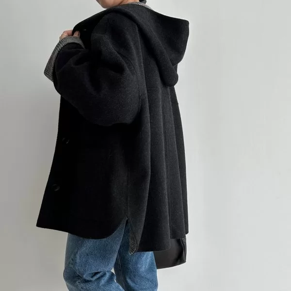 小顔効果が望める大きめフードをあしらった、前ボタン開閉のミドル丈リバーコート。オーストラリア産子羊のウール糸を織り上げたオリジナル生地は、上質さを物語るほどよいぬめり感と、ごくしなやかな肌ざわりが魅力です。リバー仕立てで縫製しているので、着心地はふんわり軽やか。前後差をつけた着丈と裾サイドのラウンドカットが、こなれ感のある着映えを叶えます。