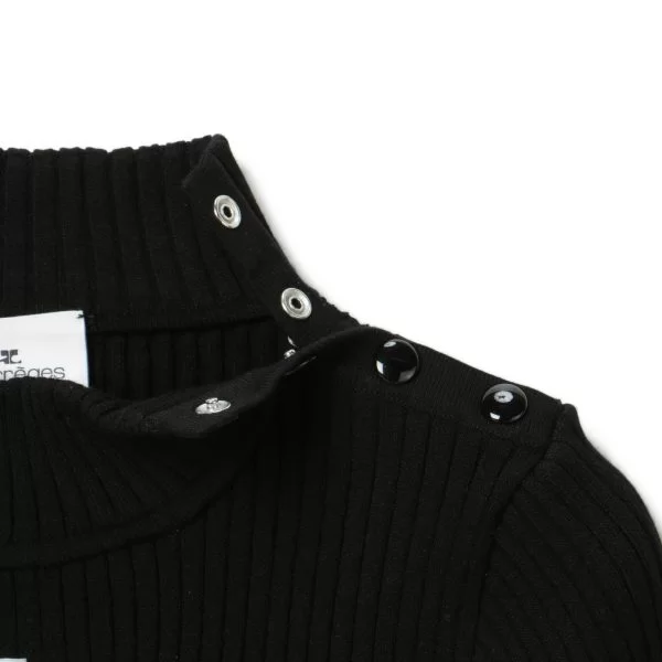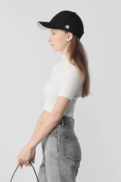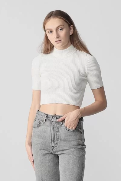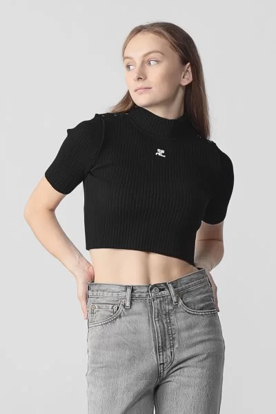 フレッシュに変身したクレージュを象徴するような一枚。大胆なクロップド丈とハイネック、半袖のバランスは、クラシカルかつモードな印象に導いてくれます。タイトな見た目だが伸縮性に優れたリブニットなので、着心地は快適。寒くなってきたらトレンドのアームカバーと合わせるスタイリングもgood。