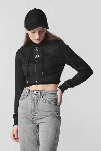 ランウェイでも多くみられたフード付きのアイテム。日常で取り入れるなら、一枚でも羽織ものとしても活躍する、ジップジャケットがおすすめ。お腹が見えるクロップド丈なので、ハイウエストのボトムスと合わせればスタイルアップ見えも叶う。