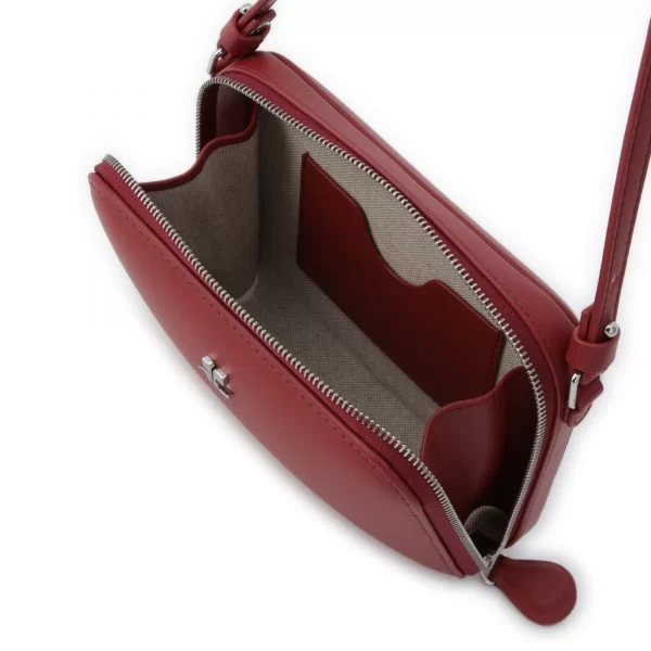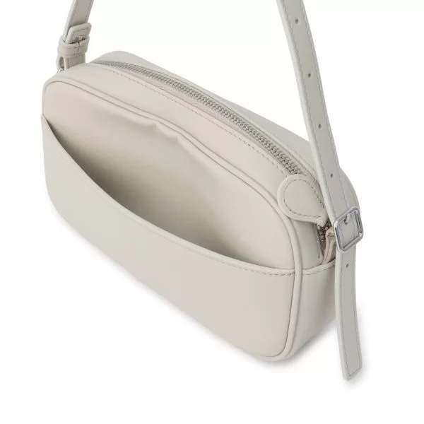 装飾を削ぎ落としたシンプルなシルエットながら、角を取り丸みをつけることで、洗練されたムードに仕上げたスクエアバッグ。前面にはロゴのメタルパーツが輝いている。細めのストラップを採用することで、全体のミニマルな雰囲気をさらに格上げした。ジップは3辺がフルで開くため、取り出しやすさも抜群。