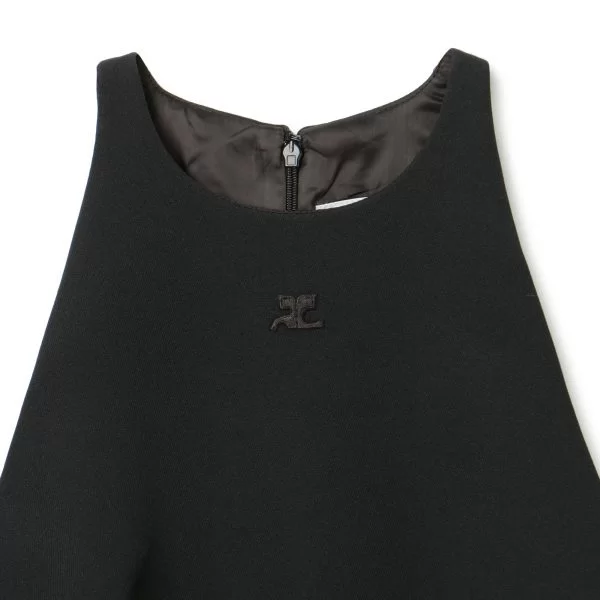 クレージュの代名詞である台形シルエットのミニ丈ドレス。胸元の高い位置に施されたロゴと、底が丸くなっているラウンドポケットがアクセントに。ハリのある生地なので、美しいシルエットをキープ。一枚でも、中にタートルネックをレイヤードしても楽しめるので、年中活躍します。