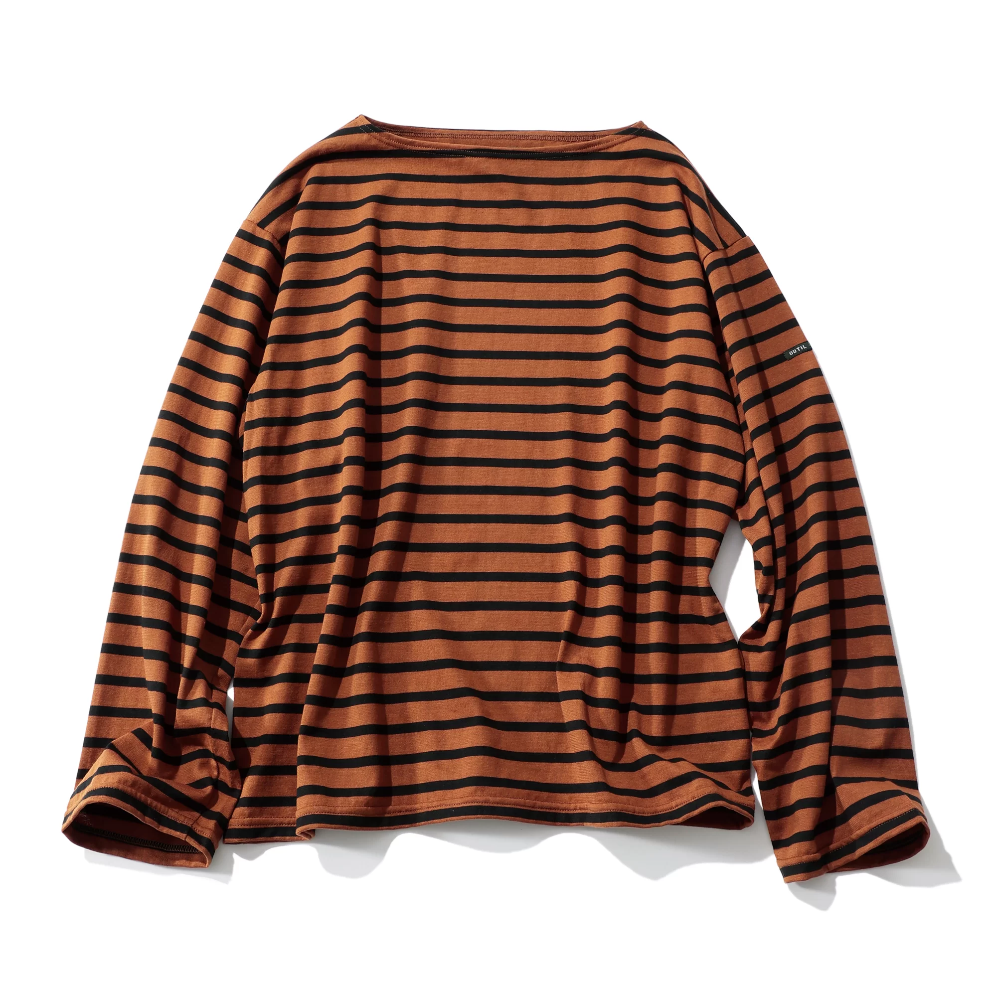 「ハピプラの名品ボーダーにランクインした大人気モデル『TRICOT AAST』。ルーズに落ちた肩、長めの袖&着丈のビッグシルットが特徴です。今回は、色からボーダーのピッチ幅まで、一からこだわって選んで別注しました。大人フレンチなネイビー×オフホワイトとベージュ×ブラックは秋のおしゃれが楽しくなる仕上がりに」(バイヤーMiyaji)