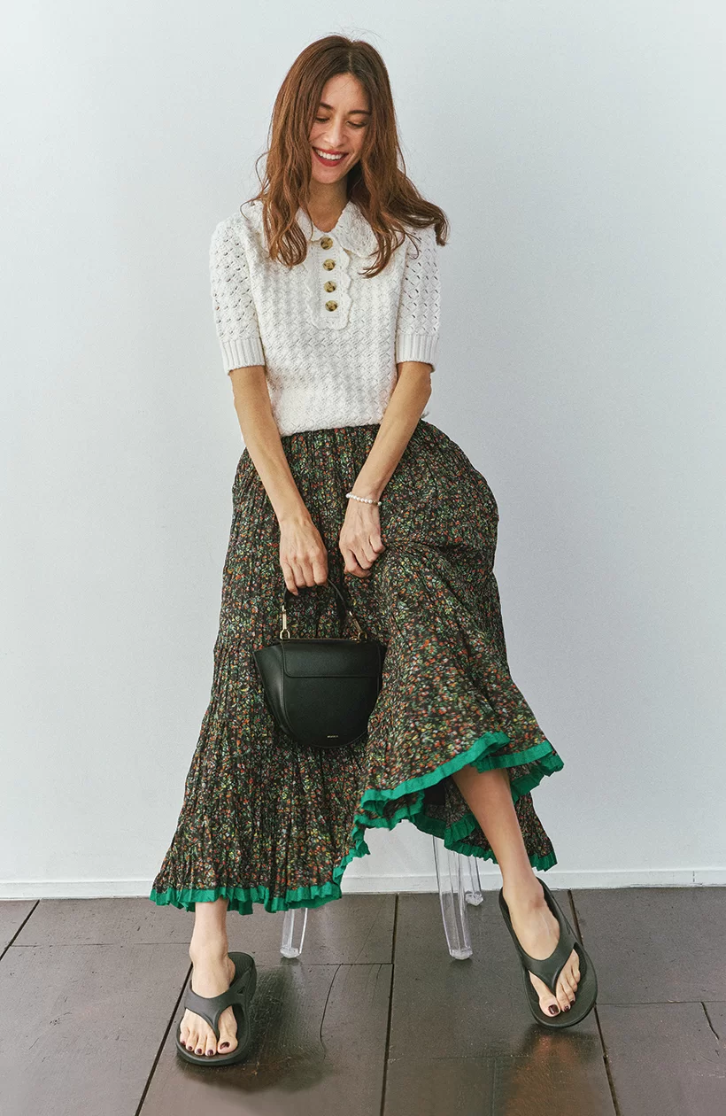 たっぷりと空気をはらむボリューム感が特徴のティアードスカート。どんなトップスを合わせてもきまるけれど、襟付きのニットポロを合わせるとぐっと今年らしく。