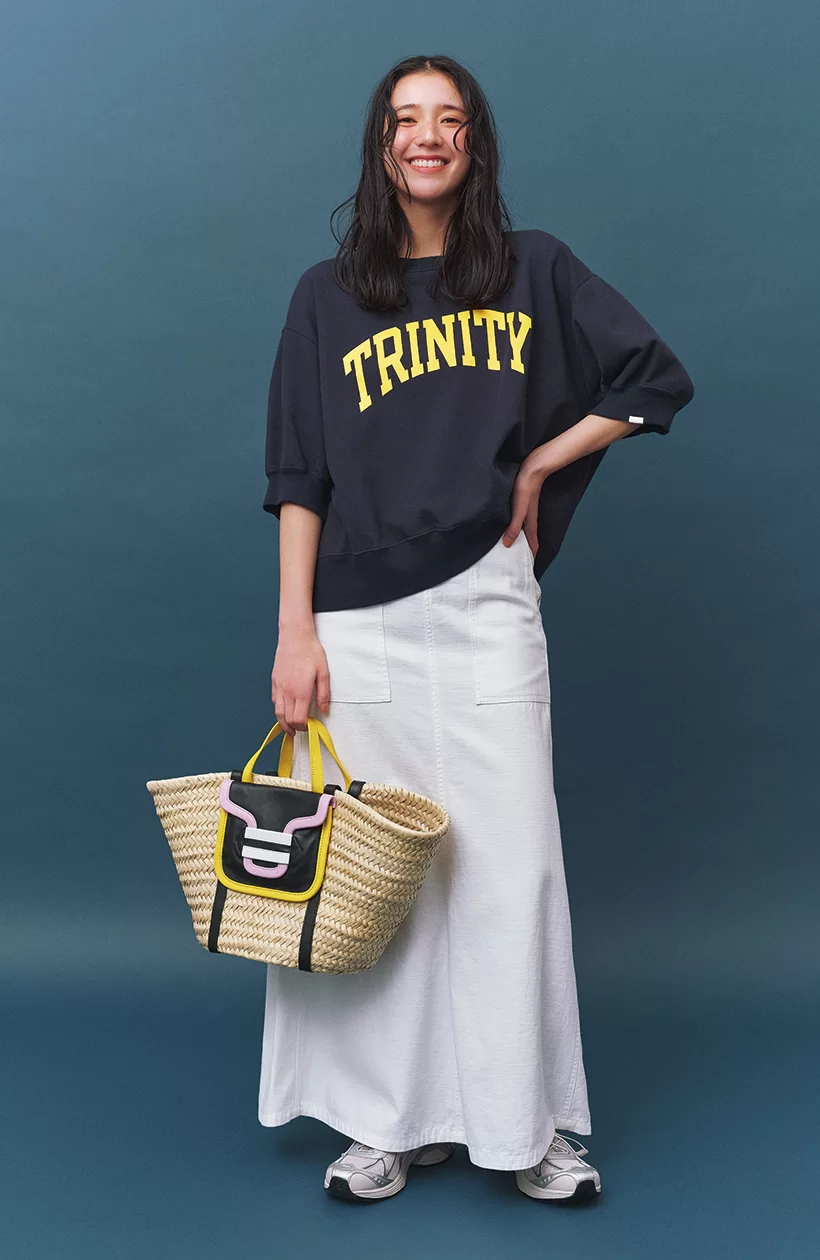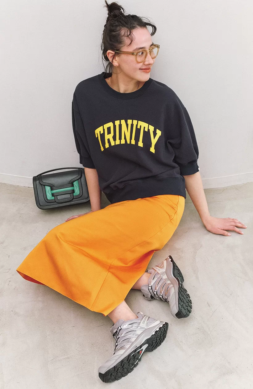 長袖のスウェットを短くリメイクしたかのような肘まである袖丈とボリューム感で、正統派のアメカジスウェットを大人っぽくアレンジ。夏らしい鮮やかなオレンジスカートを合わせて、イエローのロゴを引き立てて。
