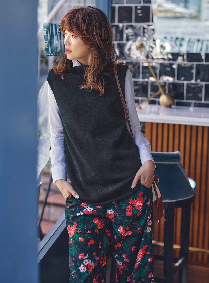 ベーシックにほんのりエッジをきかせるのが上手なアンスクリア。トレンドのベストもシックな黒とゆるめタートルでややモードに仕上げて。