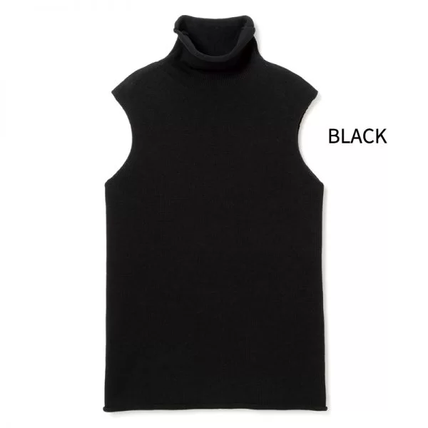 ベーシックにほんのりエッジをきかせるのが上手なアンスクリア。トレンドのベストもシックな黒とゆるめタートルでややモードに仕上げて。