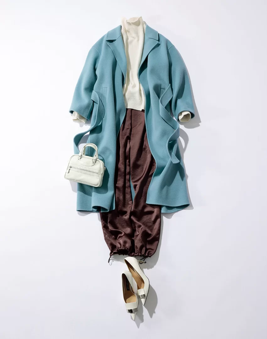 コートが主役の冬コーデにサテン素材の光沢感で鮮度をアップ。カーゴパンツの足元をキュッと絞ることで重くなりがちなロングコートの印象を軽やかに。