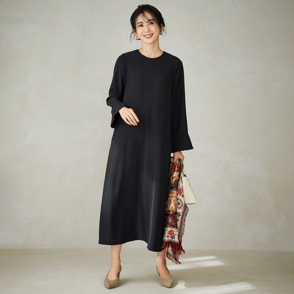 ウエストのギャザーとボリューミーなスカートのシルエットで、一枚で着ても美しく決まります。襟ぐりや袖ぐりがあきすぎないのも安心です