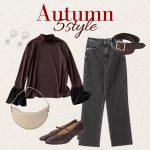季節が進んだらレイヤードを楽しんで。ネイビーブラウスにブラウンのタートルニットを差し込んでマニッシュに。