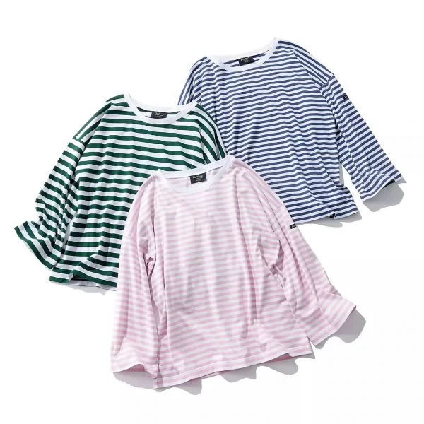 ボーダーカットソーというカジュアルアイテムを「少しでも上品に、大人が着たい」というアイテムにしたいという想いから生まれたMARINIERE BRENDA。さらっとした肌触りのスムース天竺を使用しているので、汗ばむ季節まで快適に着ていただけます。特におすすめなのは、中間色でボトムの色を選ばない深い色味のグリーン!