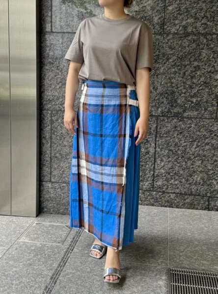 素材の落ち感をより楽しみたい方は、サイズ3でゆるっと着るのもオススメ。アースカラーのトープには、同系色合わせもいいですが、夏らしい爽やかなブルーのリネンスカートをチョイスして大人のカラーコーディネートに挑戦!