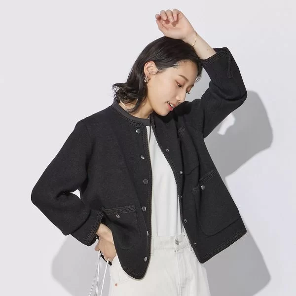 ループ糸をループ編みした、立体的な表面感が特徴のニットジャケット。ブラックベースに縁取りはアイボリーにすることで、トラッドな雰囲気に別注しました。くすんだゴールドのボタンがよりレトロな印象を高めています。長めの着丈なので、腰回りをカバーしてくれ、軽いアウター感覚で着用期間が長いのも嬉しい!デニムと合わせた着こなしがオススメです♡