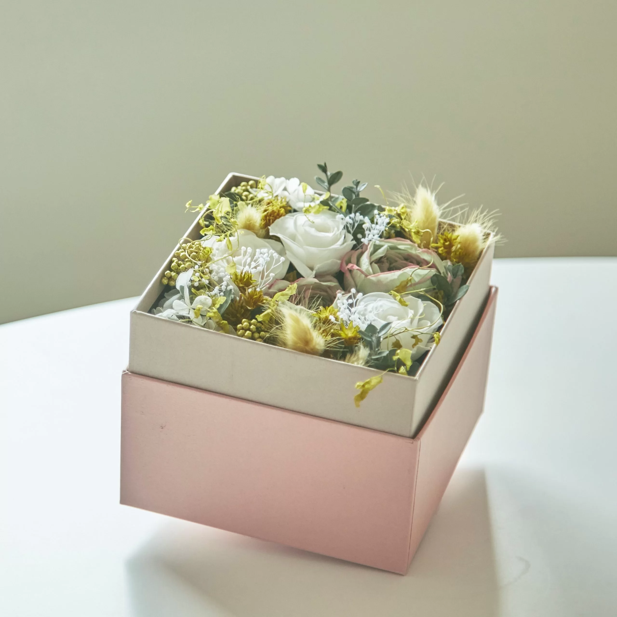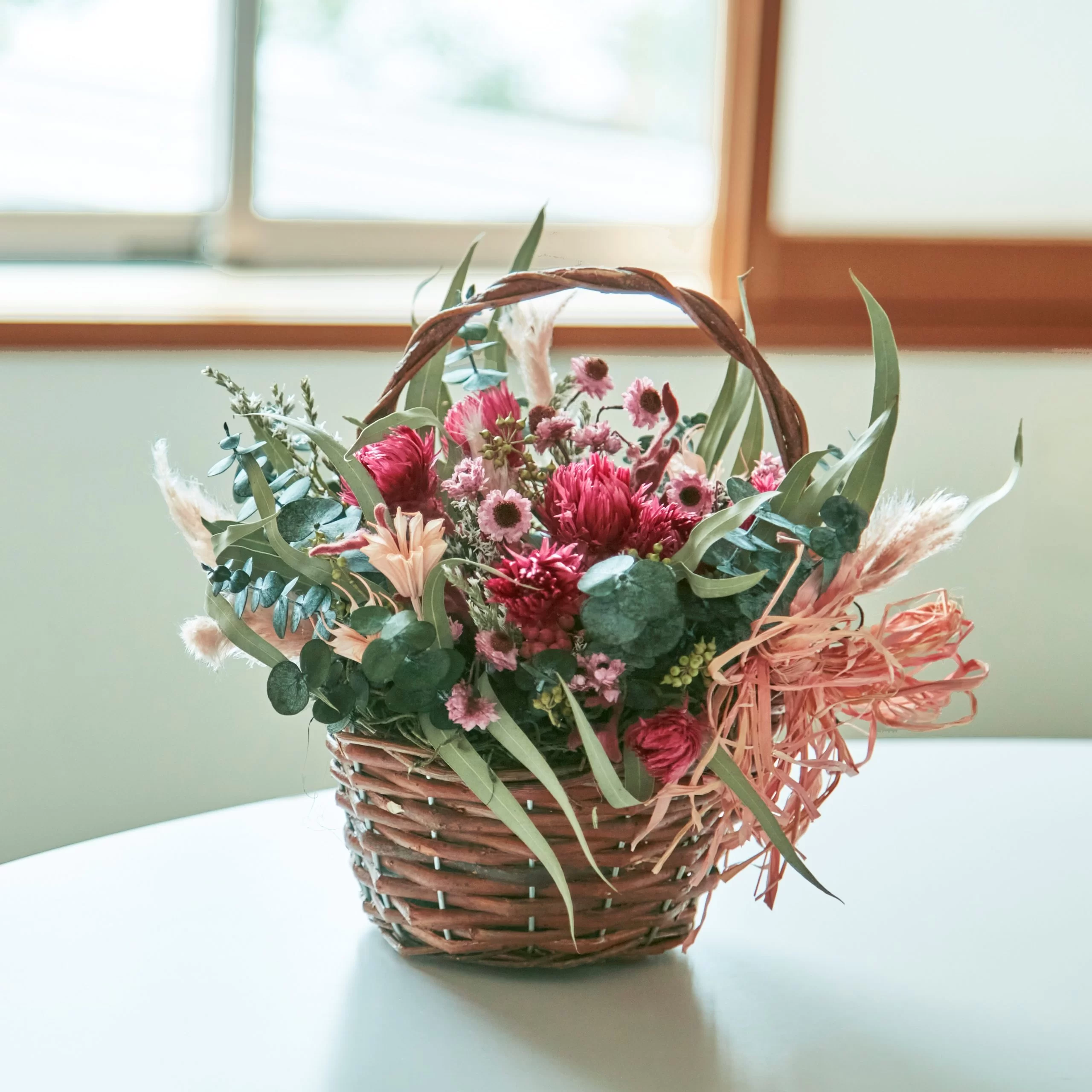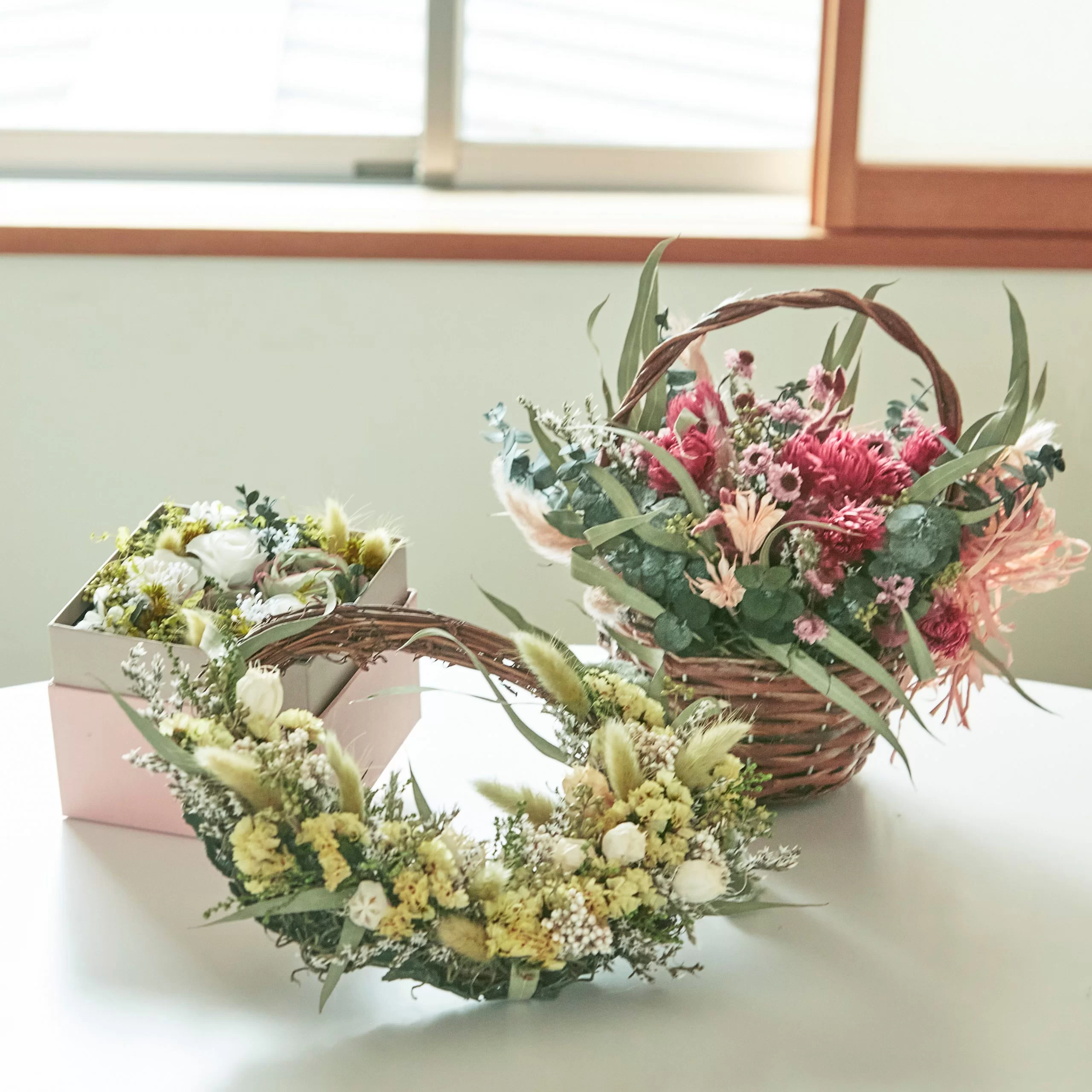 感謝の気持ちをカタチにしませんか? 特別なものを贈りたい…という方へ、HAPPY PLUS STOREでは、オリジナルのドライフラワーのアレンジメントを作りました! 壁掛けのリースタイプ、玄関の棚にそのまま飾ってもらえるBOX入りとかご入りのタイプの3種類。贈る方をイメージしながら、好みのタイプを選んで。