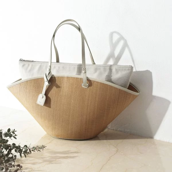 エレガントな扇形に一目ぼれ。オンオフ使える、夏の本命バッグナチュラルなラフィア調素材にレザートリミングが施された「ヴァスケット」は、開口部の広い、エレガントな扇形のシルエットが特徴。バッグの中にはキャンバス地のポーチが付いているので細々としたものの収納も安心。ポーチをあえて見せるようなデザインも新鮮です。