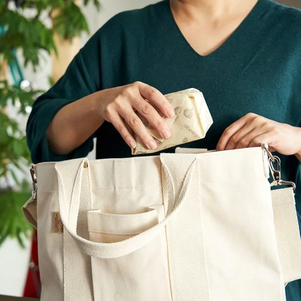 オーガニックコットンと麻の混合生地の通気性、蜜蝋とホホバオイルの抗菌性で食品の栄養素と鮮度を保つエコでサスティナブルなラップ。1年程度繰り返し使え、最後は土にへと還すことができます。