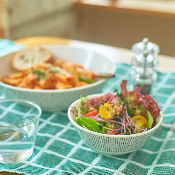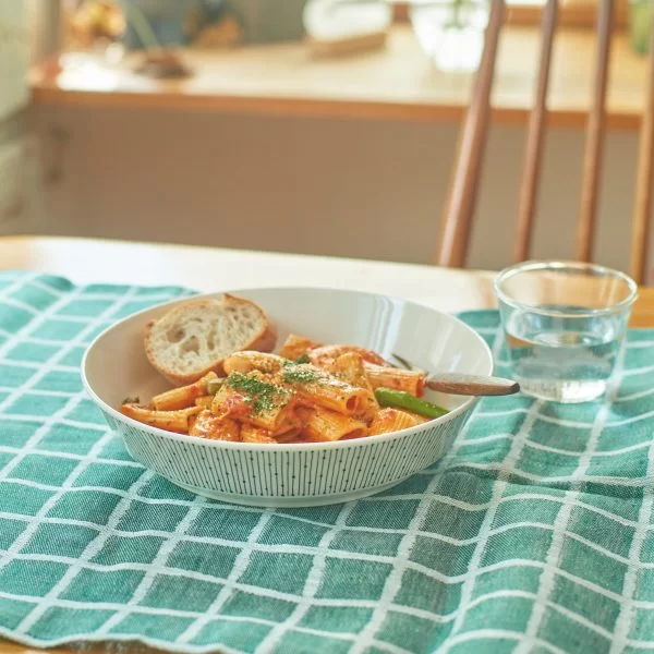 1枚でも美しく映えるフォルムのプレート。深さを活かし、パスタやサラダ、スープ、フルーツなど、幅広い料理に使うことができます。存在感があり、食卓が華やぎます。